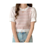 ICW Women's Acrylic Knitted Half Sleeve Round Neck Horizontal Stripe Crop Top T-Shirt