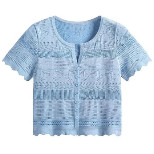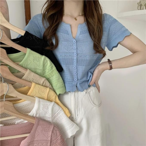 ICW Women’s Knit-Rib Acrylic Crochet Hollow Out Button-Up Crop Top T-Shirt for Girls (Bust Size 28-32 Inch)